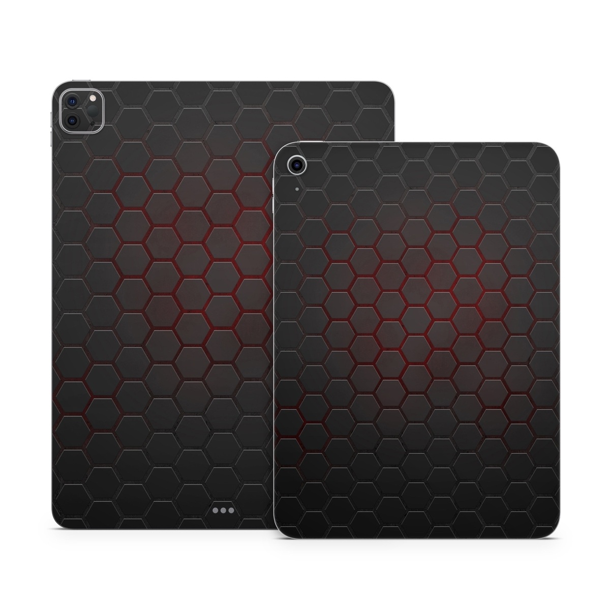 iStyles Apple iPad Series Skin design of Black, Pattern, Metal, Design, Mesh, Carbon, Space, Wallpaper, with black, red colors, and tagged with lookslike, fantasy, space, drones, geometric, hexagon, tech.