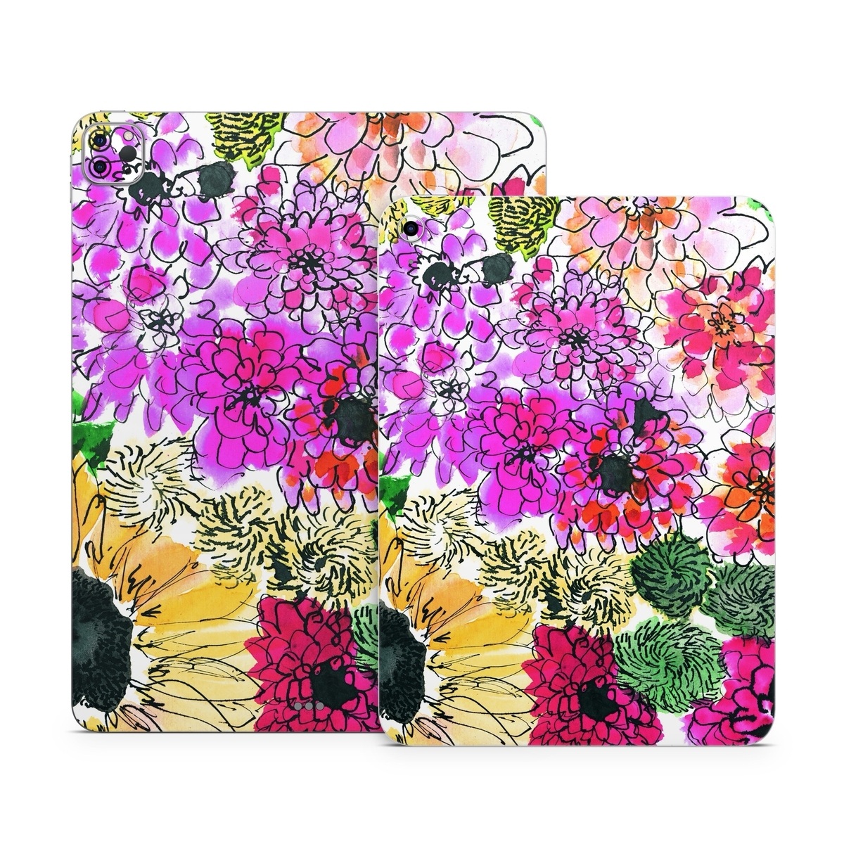 iStyles Apple iPad Series Skin design of Flower, Floral design, Plant, Gazania, african daisy, Petal, Pattern, Botany, Wildflower, Design, with red, yellow, green, pink, black colors, and tagged with patterns, flowers, bright, colorful, flowers, spring, summer, sunflower, watercolor.