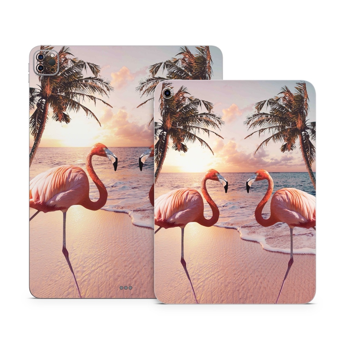 iStyles Apple iPad Series Skin design of Flamingo, Greater flamingo, Bird, Water bird, Pink, Wildlife, Sky, Tree, Organism, Beak, with pink, blue, green, yellow, white, orange, black colors, and tagged with animals, nature, animal, animals, beach, bird, birds, flamingo, ocean, palm, palmtrees, pink, sunset, tropical, tropics.