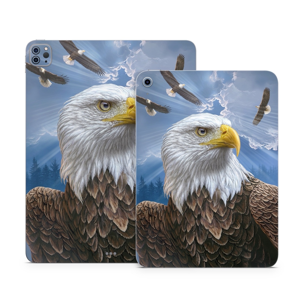 iStyles Apple iPad Series Skin design of Bird, Bald eagle, Bird of prey, Vertebrate, Accipitriformes, Accipitridae, Eagle, Nature, Beak, Kite, with blue, brown, white, yellow colors, and tagged with animals, nature, america, animals, birds, eagle, nature.