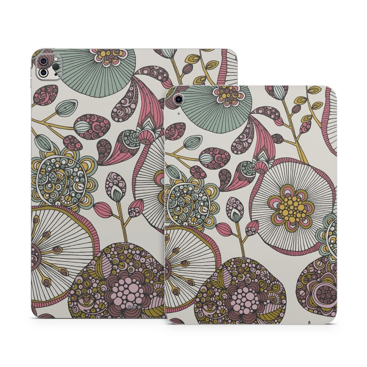 iStyles Apple iPad Series Skin design of Pattern, Textile, Botany, Visual arts, Motif, Design, Needlework, Circle, Floral design, with gray, pink, green, blue, purple colors, and tagged with flowers, patterns, flowers, lotus, monochromatic, mute, pattern.