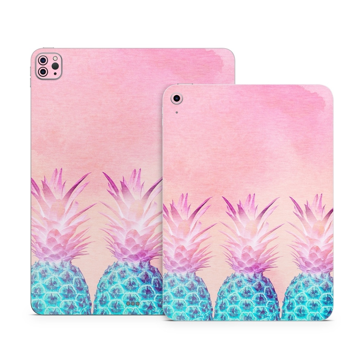 iStyles Apple iPad Series Skin design of Pineapple, Ananas, Pink, Fruit, Plant, Bromeliaceae, Pattern, Poales, with pink, blue, orange colors, and tagged with patterns, bright, fruit, pineapple, pink.