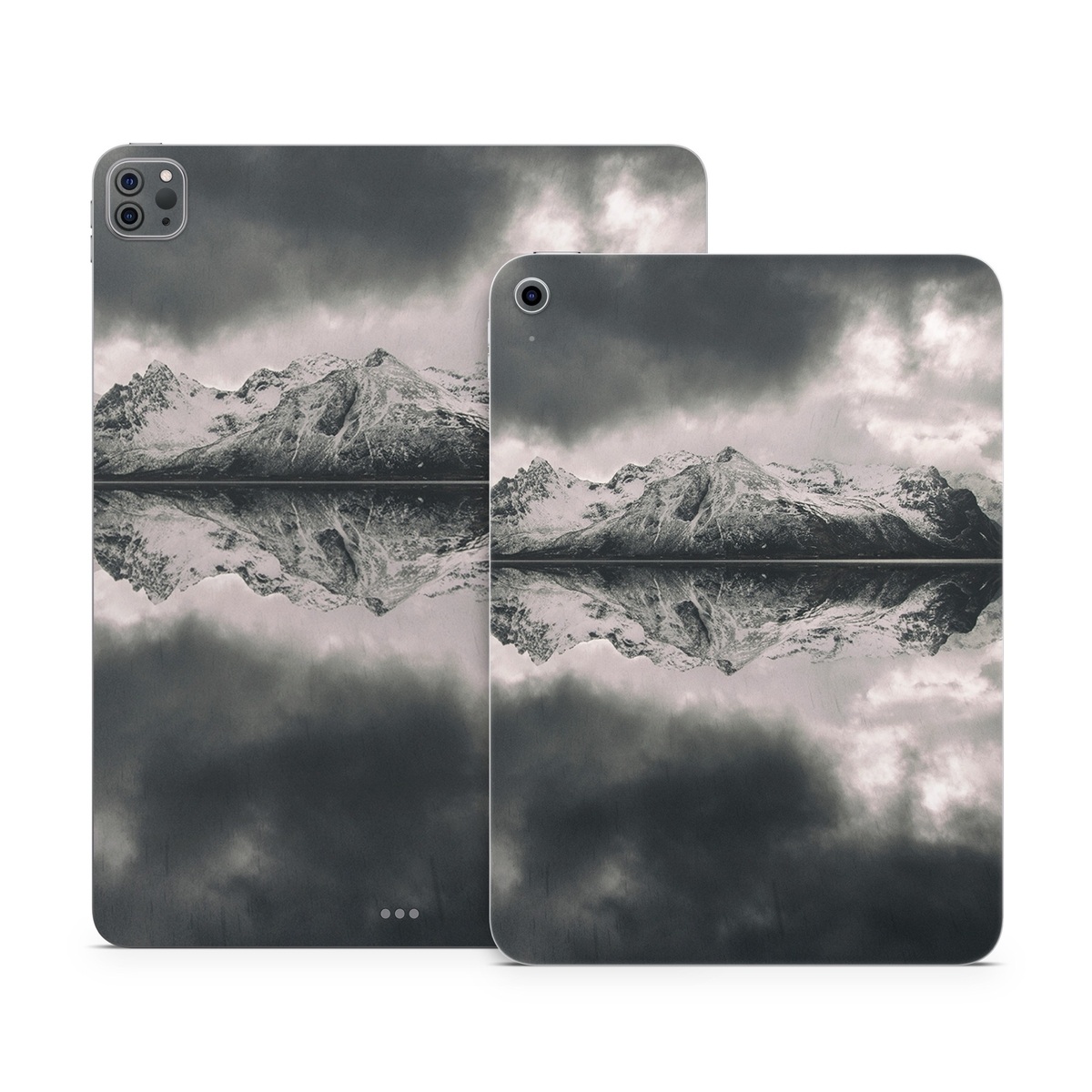 iStyles Apple iPad Series Skin design of Sky, Cloud, Nature, Reflection, Water, Atmospheric phenomenon, Daytime, Black-and-white, Atmosphere, Calm, with white, black, gray colors, and tagged with nature, photos, dark, lake, landscape, mountains, photo, photography.