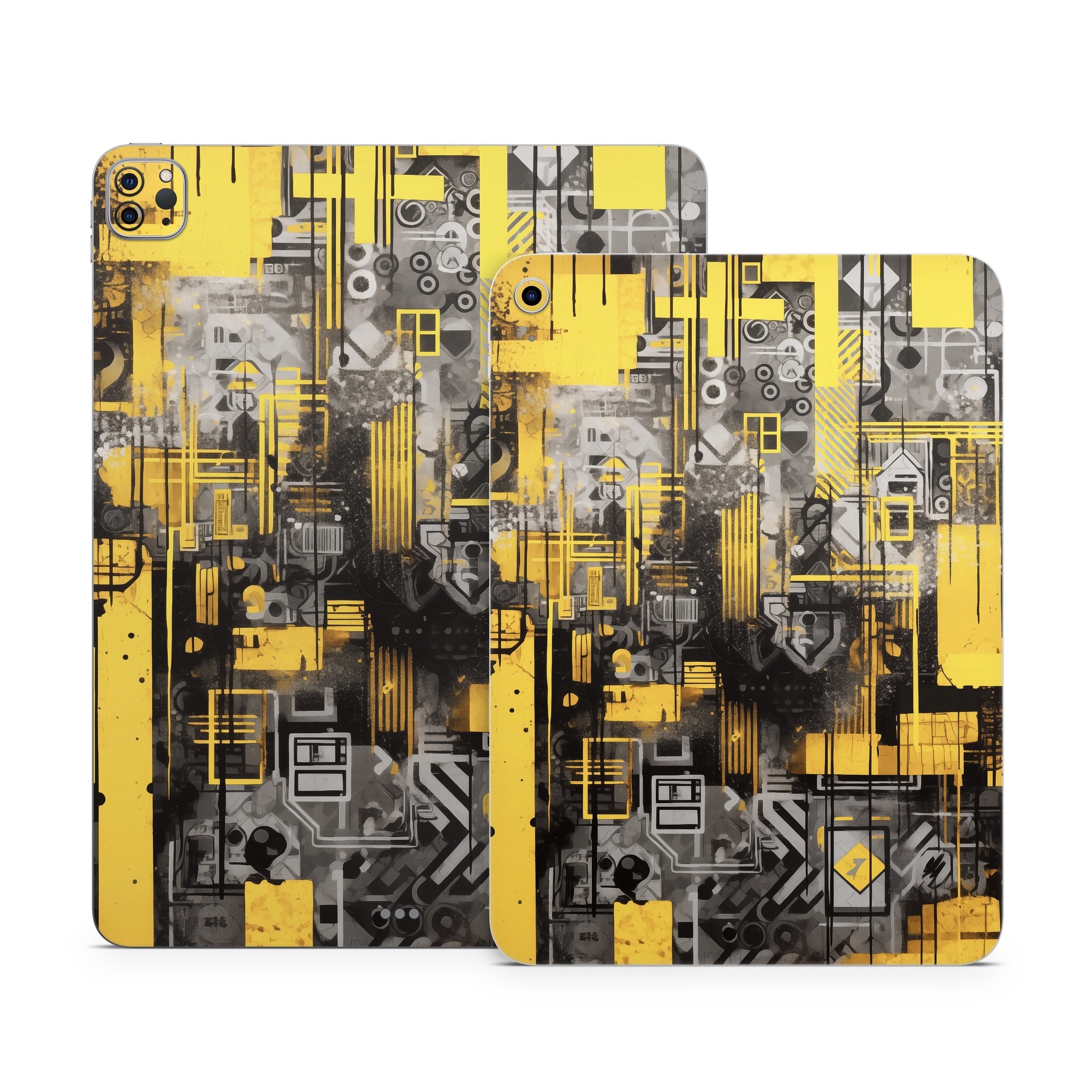 iStyles Apple iPad Series Skin design of Rectangle, Yellow, Font, Art, City, Engineering, Tints and shades, Pattern, Symmetry, Space, with black, white, gray, yellow colors, and tagged with abstract, confusion, work.