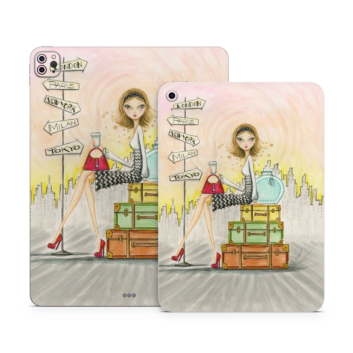 iStyles Apple iPad Series Skin design of Cartoon, Illustration, Art, Watercolor paint, with gray, pink, green, red, black colors, and tagged with people, signs, objects, urban, fashion.