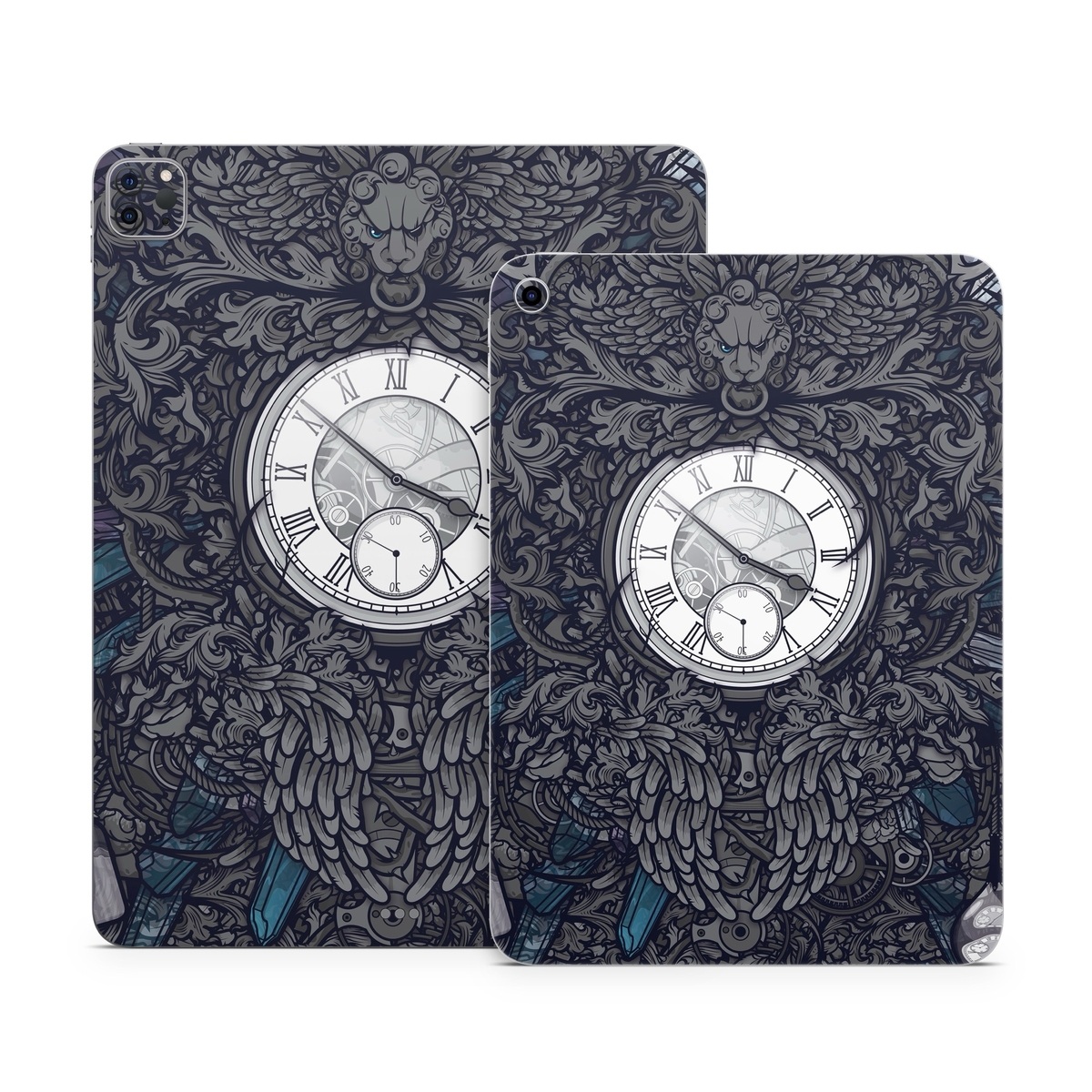 iStyles Apple iPad Series Skin design of Blue, Pattern, Psychedelic art, Design, Circle, Art, Font, Graphic design, Visual arts, Illustration, with black, gray colors, and tagged with objects, patterns, animals, grandfather, clock, clocks, alarm, time, antique, table.