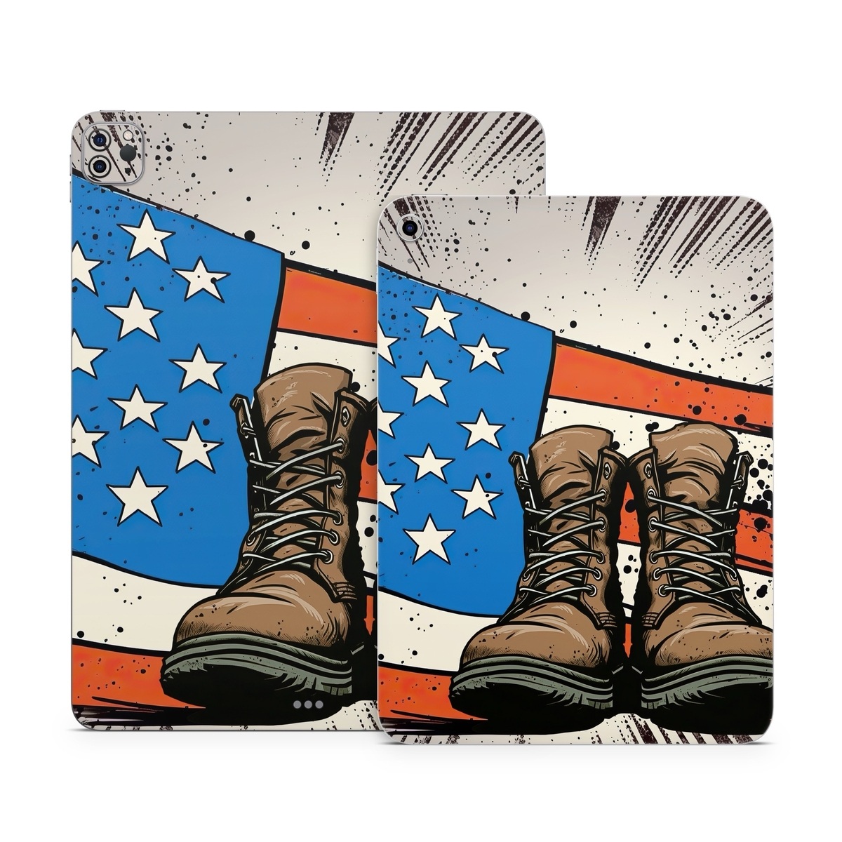 iStyles Apple iPad Series Skin design of Footwear, Shoe, Walking shoe, Outdoor shoe, Line, Flag of the united states, Sneakers, Font, Art, Human leg, with red, blue, white, black, brown, gray colors, and tagged with flags, objects, signs, military, united, states, flag, military, boots, walking, training.