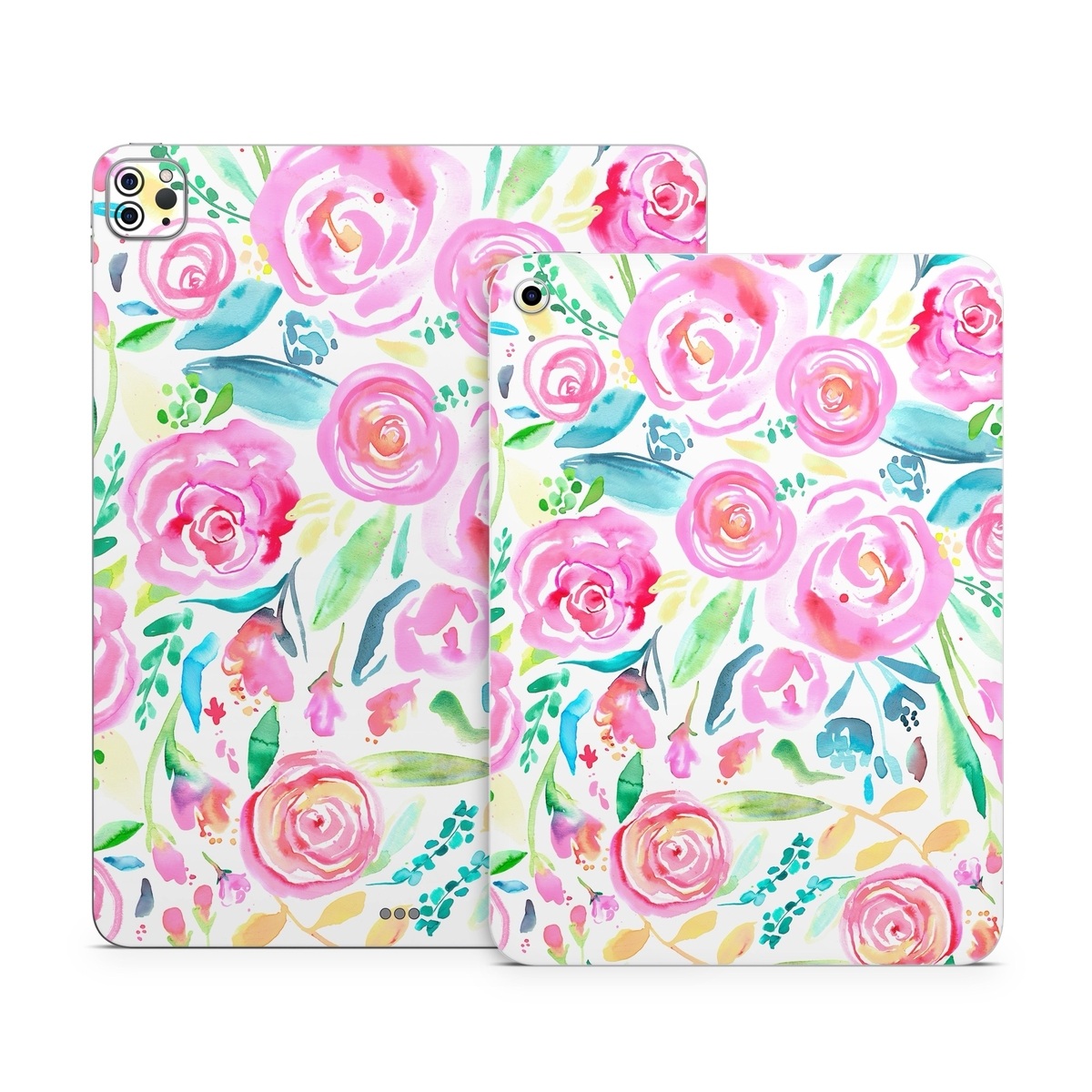 iStyles Apple iPad Series Skin design of Flower, Plant, Petal, Pink, Art, Material property, Magenta, Flowering plant, Pattern, Rose family, with white, pink, green, blue, yellow colors, and tagged with patterns, flowers, flower, flowers, garden, pastel, rainbow, rose, roses, watercolor.