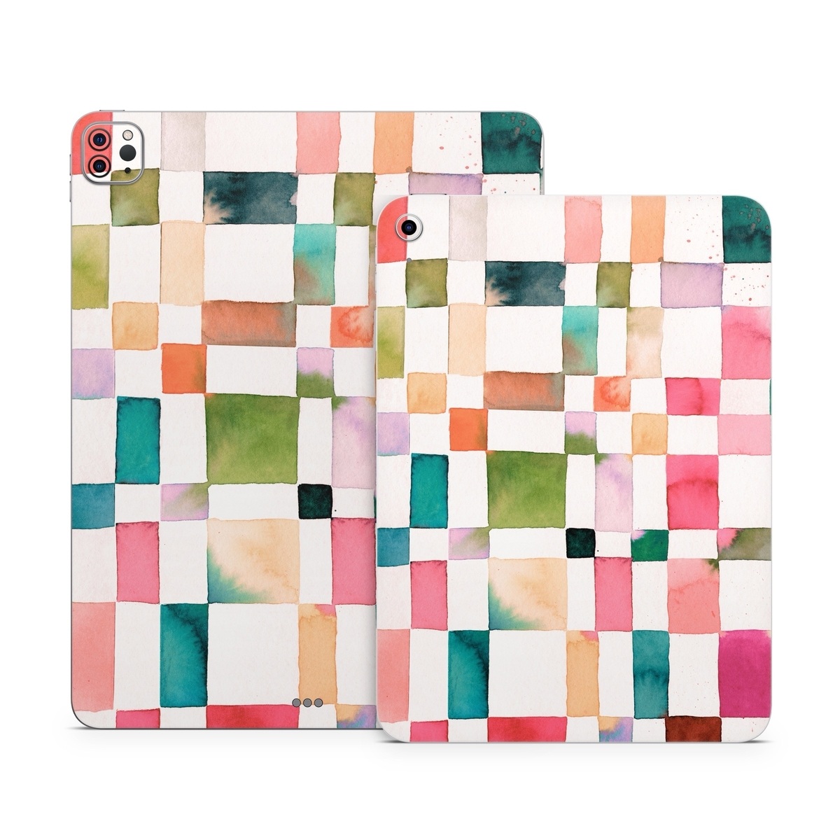 iStyles Apple iPad Series Skin design of Brown, Rectangle, Product, Textile, Art, Pink, Line, Aqua, Magenta, Symmetry, with white, pink, green, red, blue, orange, purple colors, and tagged with patterns, checkers, geometric, pattern, shapes, squares, watercolor.
