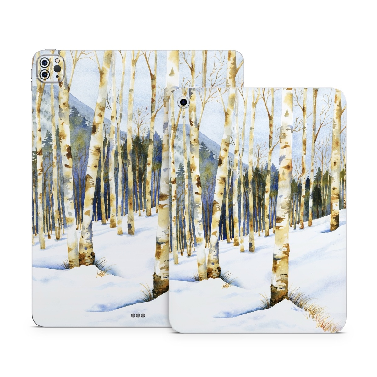 iStyles Apple iPad Series Skin design of Tree, Snow, Winter, Canoe birch, Nature, Birch, Forest, Natural environment, Freezing, Woody plant, with white, brown, black, gray colors, and tagged with patterns, nature, mountain, outdoors, snow, winter, woods.