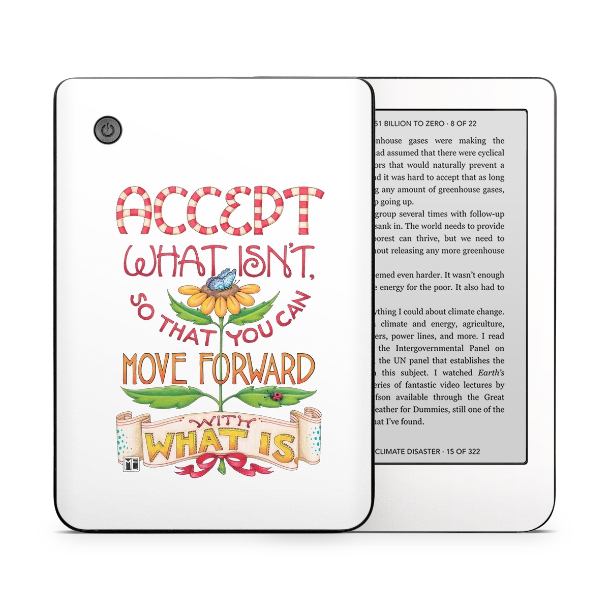 iStyles Kobo Clara 2E Skin design of Butterfly, Sun-Flower, Leaves, with white, red, green, brown, yellow, blue, orange, black colors, and tagged with signs, flowers, animals, flower, garden, motivation, quote, quotes, sayings, words.