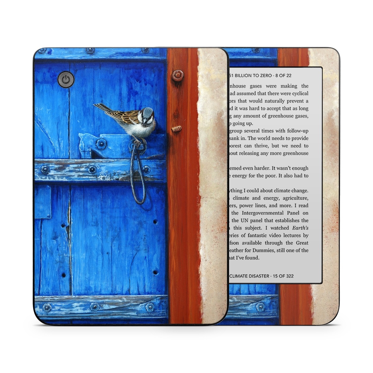 iStyles Kobo Clara 2E Skin design of Blue, Wood, Door handle, Door, Wall, Door knocker, Electric blue, Still life photography, Window, Handle, with red, blue, brown colors, and tagged with animals, fineart, animal, bird, birds, fineart, outdoors.