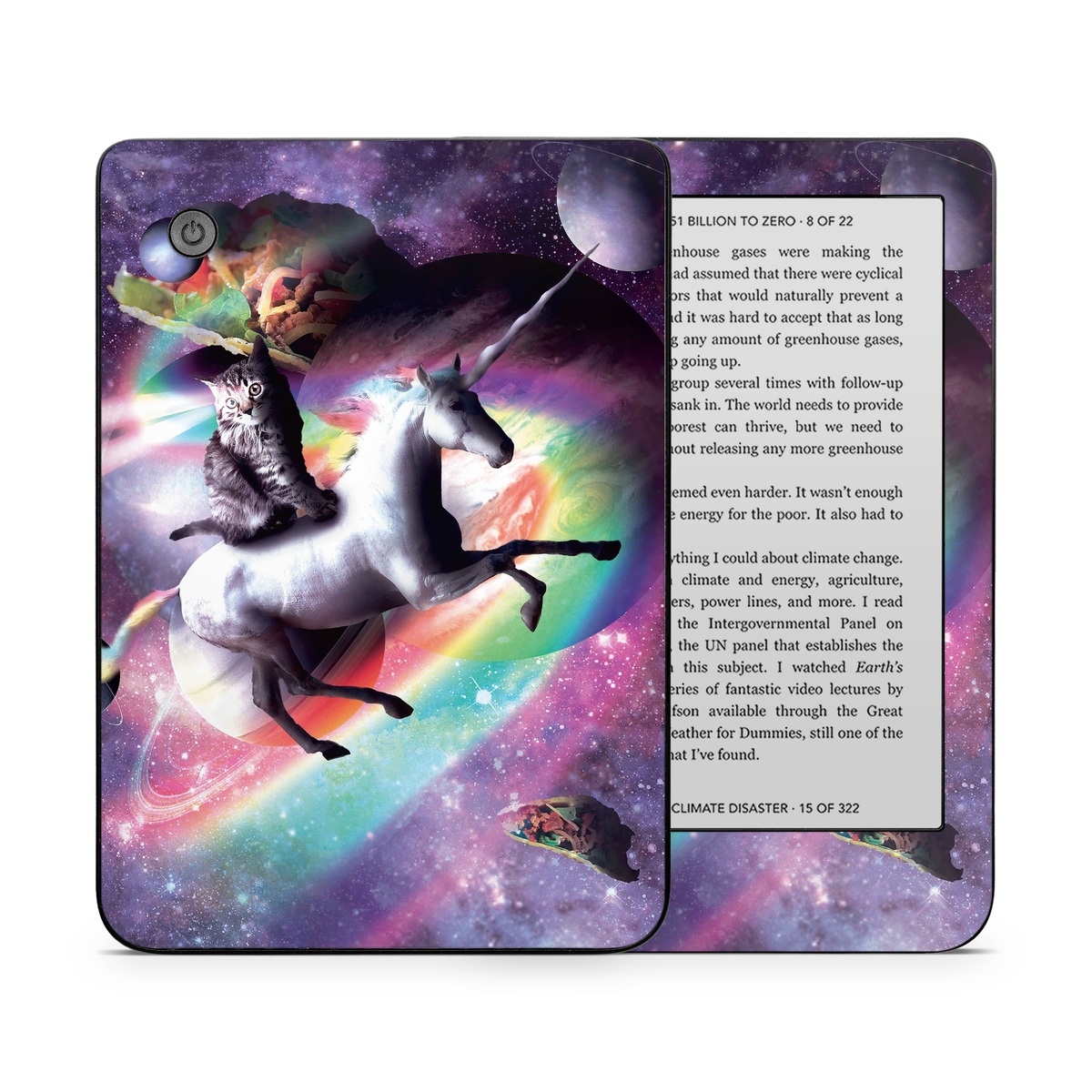 iStyles Kobo Clara 2E Skin design of Illustration, Graphic design, Fictional character, Space, Sky, Astronomical object, Universe, Outer space, Art, Unicorn, with black, white, gray, red, yellow, green, blue, orange colors, and tagged with space, animals, fantasy, animals, funny, galaxy, lasers, random, space, weird.
