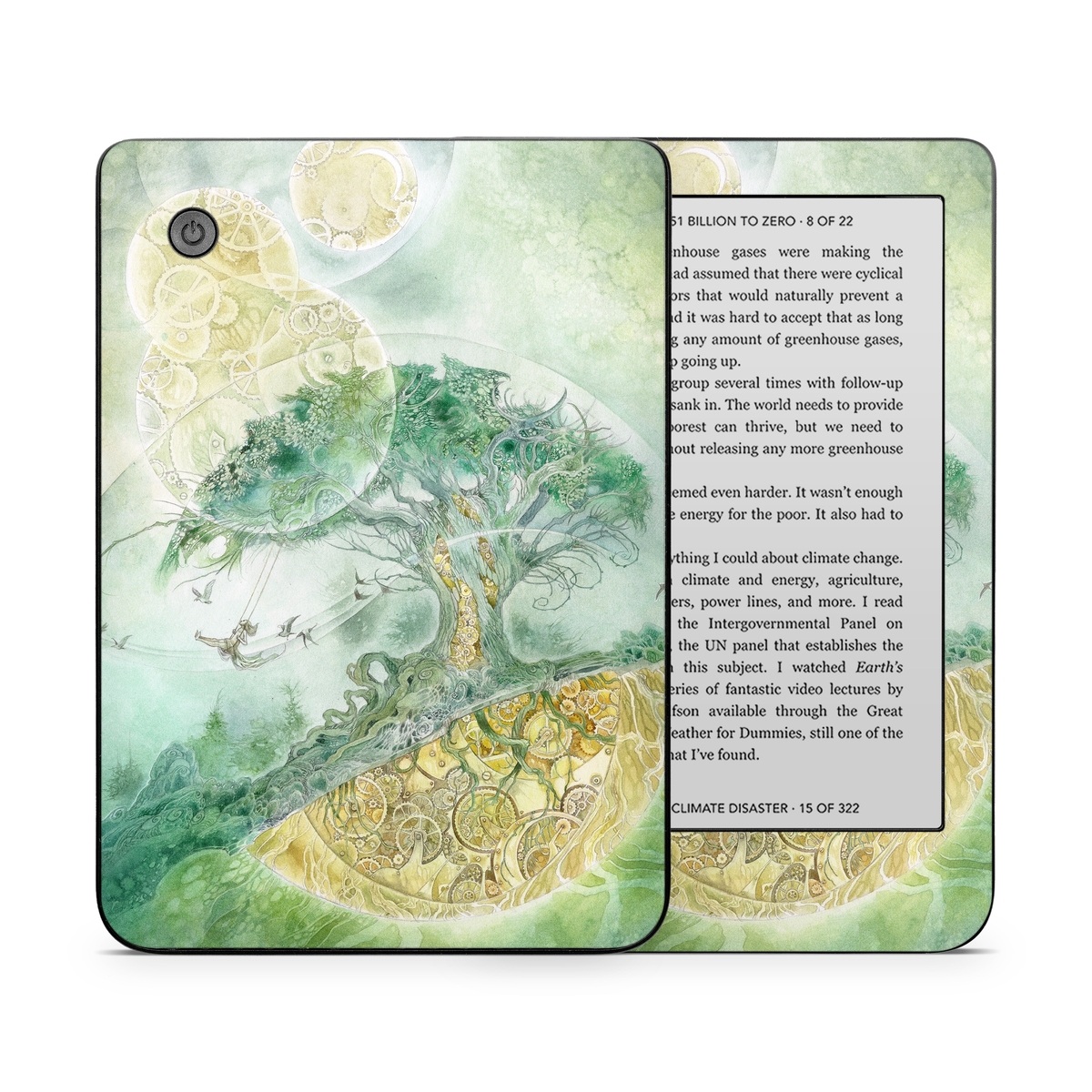 iStyles Kobo Clara 2E Skin design of Illustration, Organism, Art, World, Fictional character, with green, yellow, brown colors, and tagged with animals, nature, people, objects, birds, gears, swing, tree.