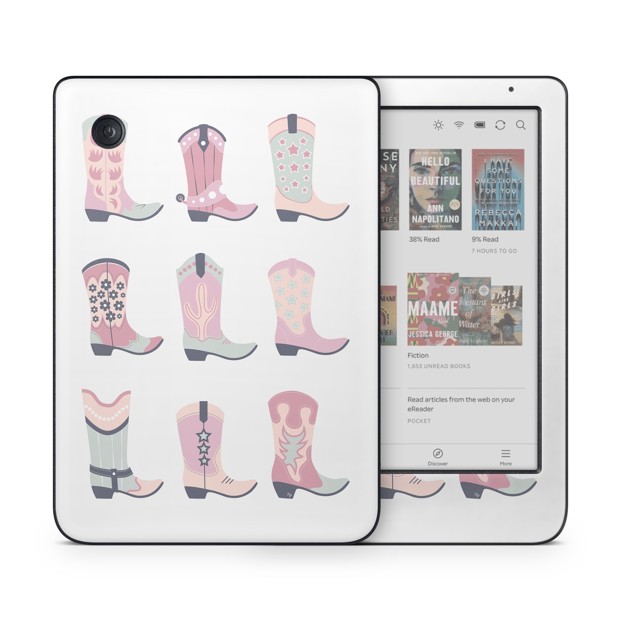 iStyles Kobo Clara Colour Skin design of Footwear, Shoe, White, Durango boot, Product, Fashion, Textile, Pink, Font, Red, with pink, white, blue, brown colors, and tagged with patterns, objects, fashion, flowers, girl, shoes, boots, cowgirl.
