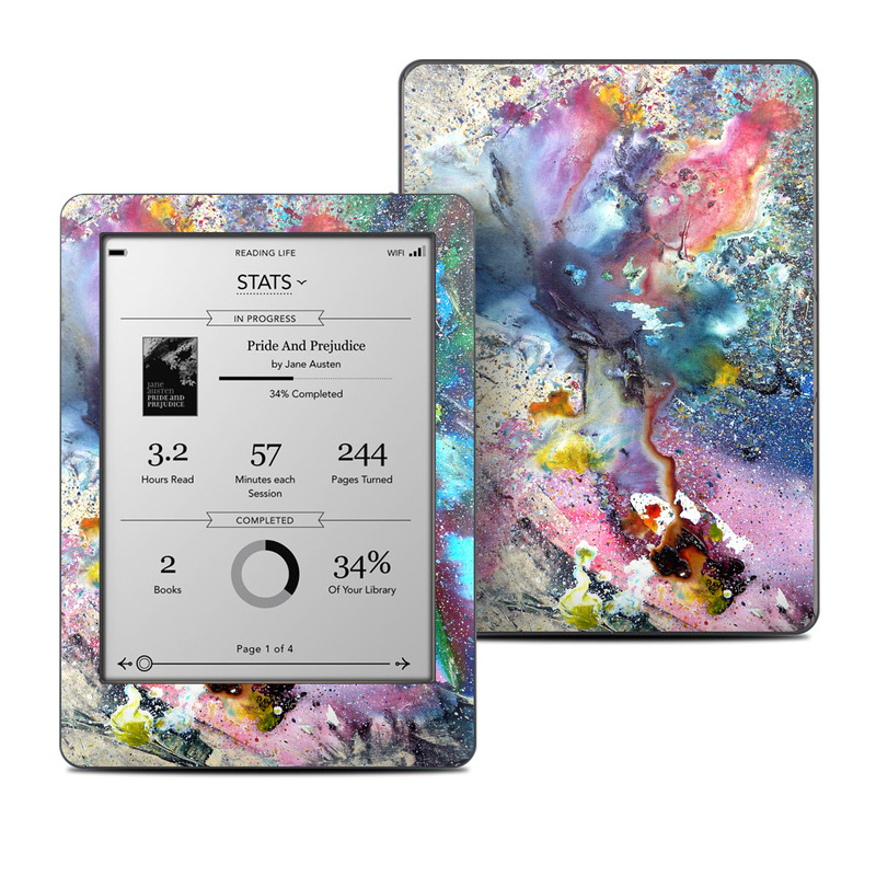 iStyles Kobo Glo Skin design of Watercolor paint, Painting, Acrylic paint, Art, Modern art, Paint, Visual arts, Space, Colorfulness, Illustration, with gray, black, blue, red, pink colors, and tagged with space, fantasy.