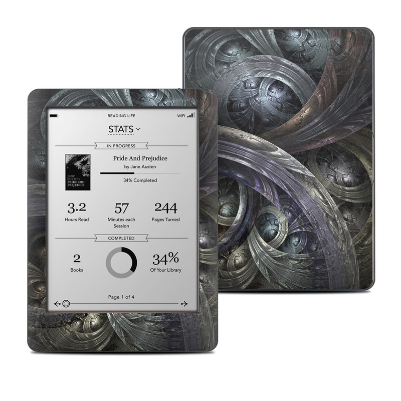 iStyles Kobo Glo Skin design of Fractal art, Graphic design, Art, Cg artwork, Darkness, Circle, Pattern, Illustration, Graphics, Metal, with black, gray, blue colors, and tagged with fractals.