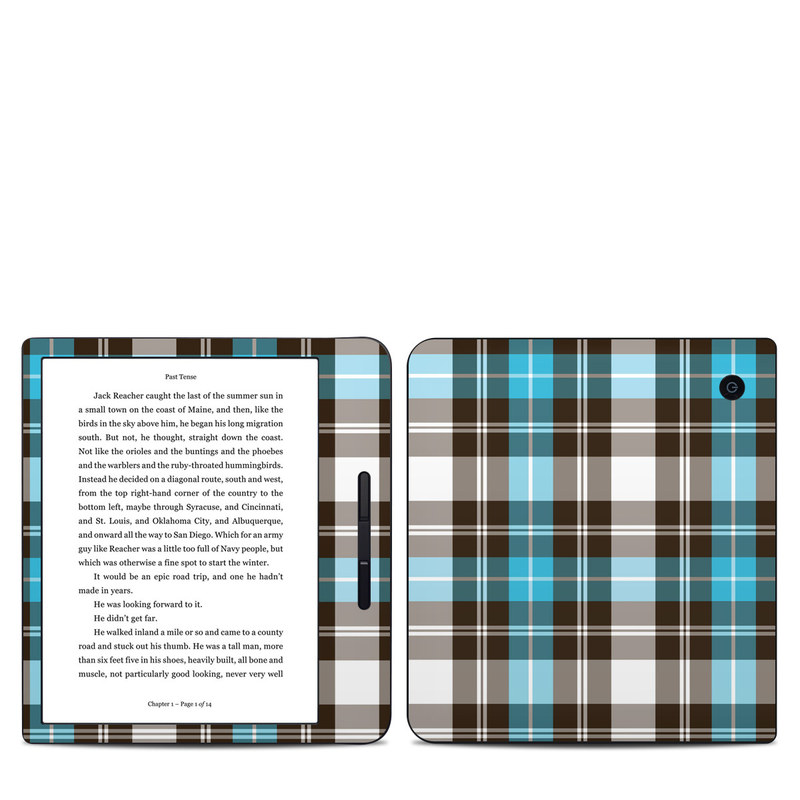 iStyles Kobo Libra H20 Skin design of Plaid, Pattern, Tartan, Turquoise, Textile, Design, Brown, Line, Tints and shades, with gray, black, blue, white colors, and tagged with patterns.